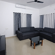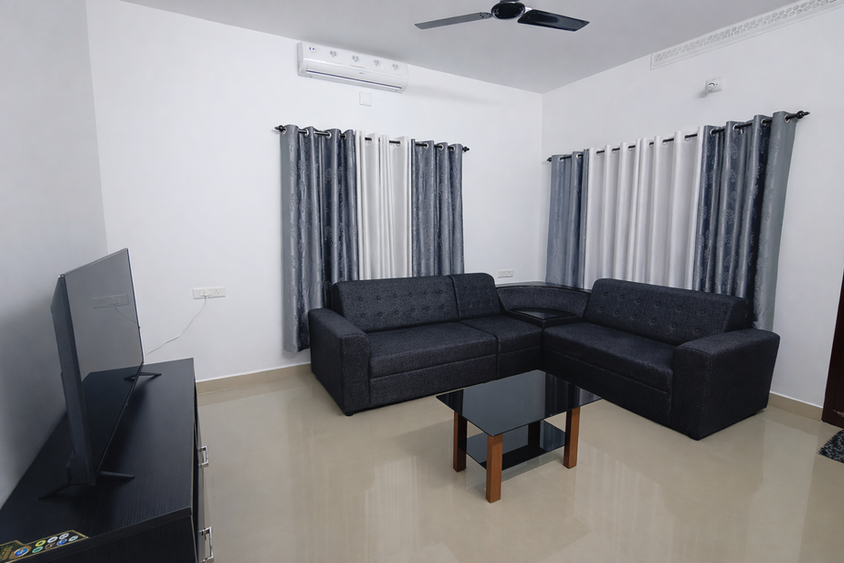 The home features two pristine bathrooms with a geyser, hair dryer, shower curtain, and all essential toiletries. Stay connected with free Wi-Fi and relax with a 43” Smart TV, supported by UPS backup for uninterrupted comfort.